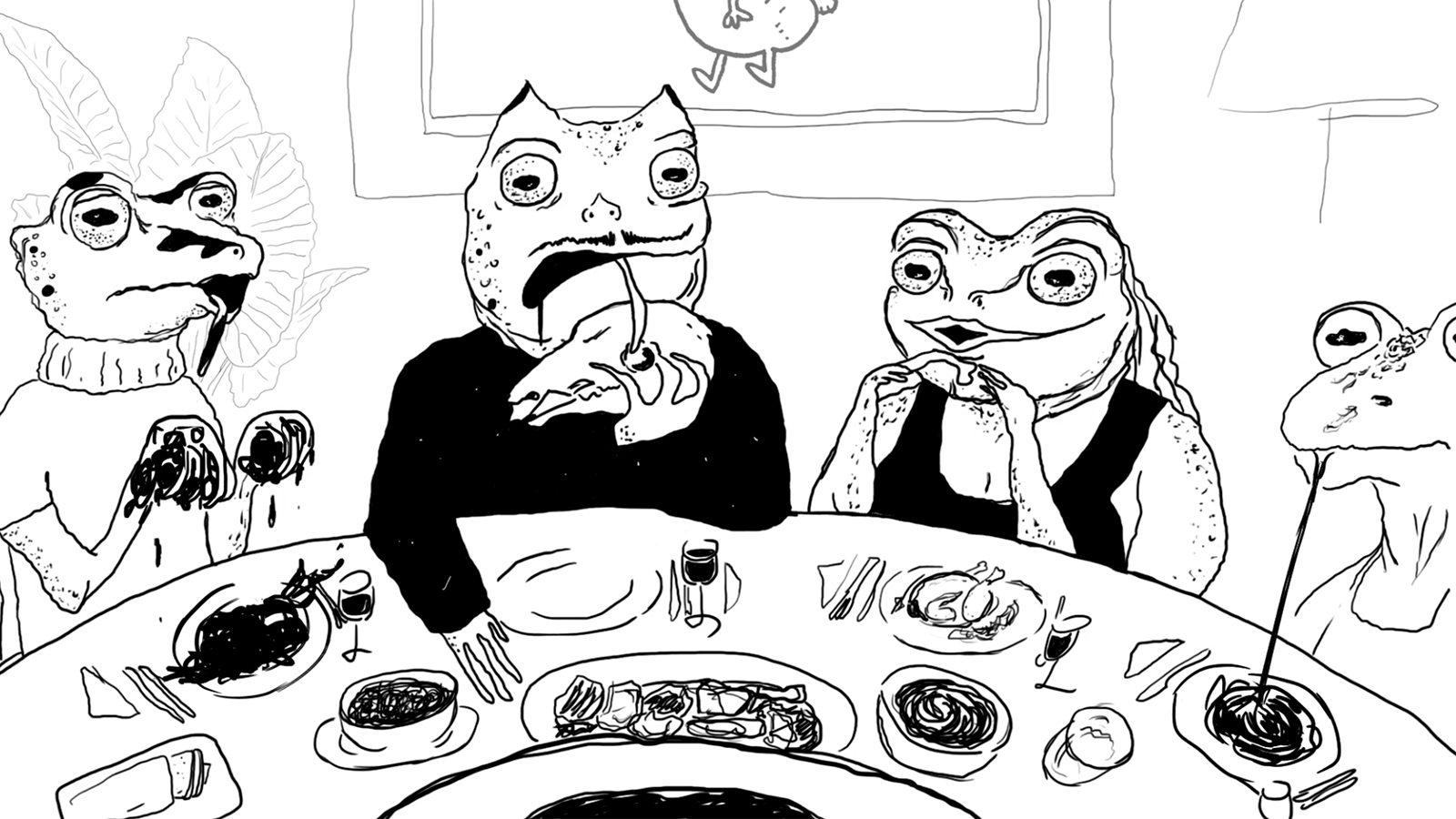 I see an animal with memories. It doesn’t have a tail, it has protruding eyes, strong limbs and slimy skin. I try to catch it but it’s impossible. It’s a frog. It is accompanied by four beings. They have arms, no tail, and are not humans. They love eating at the table. They are not frogs but could easily be mistaken for them.